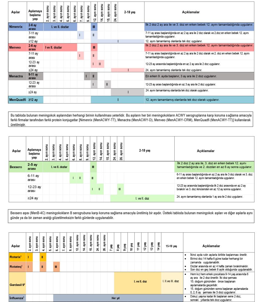 Aşağıda T.C. Sağlık Bakanlığı tarafından yapılan ulusal aşı şeması ile rutin dışında yapılan aşıların şemasını inceleyebilirsiniz. Sorularınız olursa bizlerle iletişime geçebilirsiniz